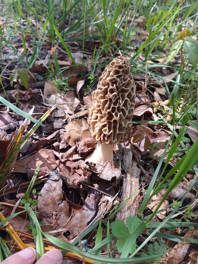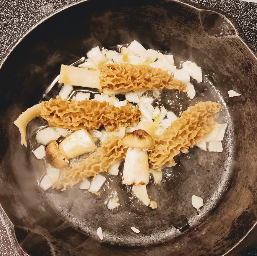On April 8, we were near the path of totality during the lunar eclipse. As we were walking to our watch spot with friends, I saw the strangest looking thing on the ground: something tannish in color with an unusual pattern. “Damien! It’s a morel!” I shouted. “There’s another one! And another!” we exclaimed as we carefully tiptoed through the clearing under oaks and cedars. Aware that false morels exist, and unwilling to haphazardly harvest wild mushrooms, we made a note of where they were and went on to our eclipse watch spot. After those surreal four minutes, we walked back to the morels and took photos to compare to an image search of the real thing. As it turns out, they were the real deal indeed, and we harvested one single morel to take back home to try.