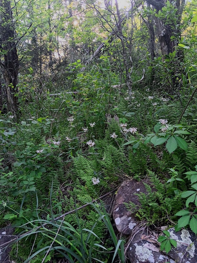 That was the height of early spring foraging, but we’ve also harvested chickweed, pepperweed, wild onions, and garlic over the past month to add to our dishes. I’ve been collecting the largest leaves on several mullein plants growing around the field and drying them for tea. Most recently, I’ve found wild bergamot growing throughout the woods. Its flowers smell like pine and orange with subtle mint undertones, and it tastes pretty much how it smells. I am careful not to overharvest, but I’ve been gathering a few flowers whenever we go on walks. Now, in early May, the flowers are blooming all over the forest.