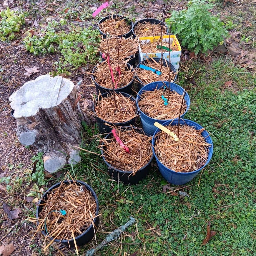 We bought from the sale again this year, bringing home apple, peach, pecan, serviceberry, elderberry, pecan, dogwood, redbud, persimmon, witch hazel, paw paw, and red maple trees. It’s an arduous task to plant all of these trees, and we do have day jobs. So, some of the trees were planted in the ground while others got planted into big pots to buy us some time. Many of them have already begun to sprout leaves– and the elderberries we planted from last year’s sale are coming back as well!